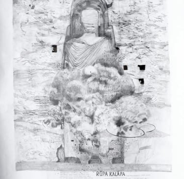 The work that I made fluctuated between the desire to connect the children to the river that runs beside us, the conversations we had, and the dark events that took place in the world, especially in my home country that cut through everything. On 15 March 2019, two mass shootings, one after the other, occurred in a terrorist attack on two mosques in Christchurch, New Zealand. It made me, as well as many of my fellow New Zealanders sick. We all grieved. My family is not a stranger to the terror of cold-blooded killing at the hands of a person pointing a gun. The image of a person, in some altered state of mind, walking with a gun, raising it, shooting it, I think will haunt me for the rest of my life … In response to the shootings, I found myself drawing ghostly people and holy places and monuments that have been destroyed.
