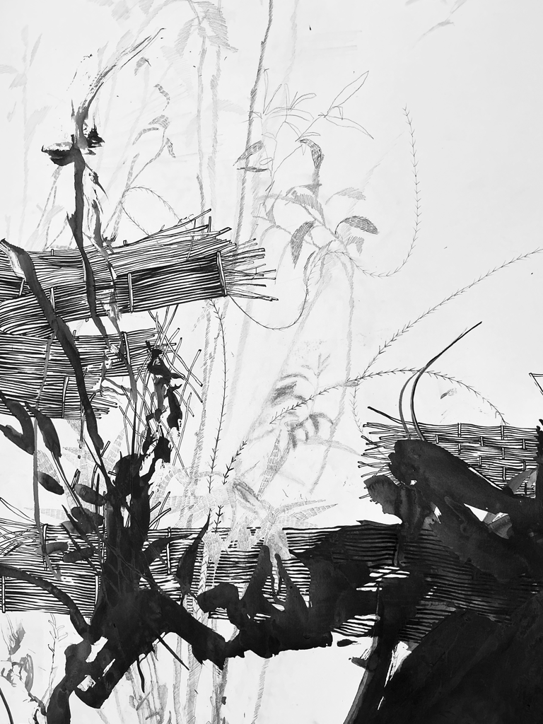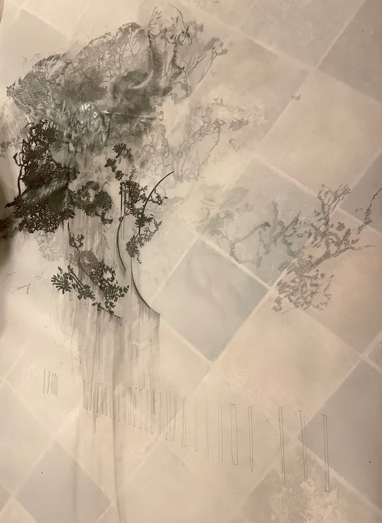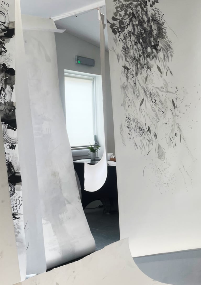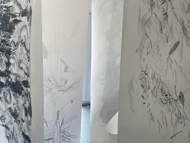 Developed through doctoral research, these long-format drawings explore paper as a relational field. Working with graphite and ink — and through processes of layering, erasing and reworking — I approach drawing as an expanded, spatial practice. Installed architecturally in extended scroll formats, the works move between surface and environment, holding density, interruption and return.